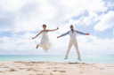 どこまでも何層にも広がる海がキレイなビーチへ移動するおふたり
