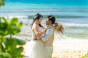 ビーチでおふたり 透き通る海を背に 嬉しそうそうな表情
