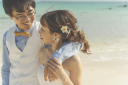 ビーチへ移動したおふたり キラキラと輝く海面が美しく輝く