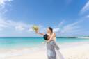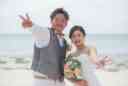 着いたよ!と笑顔のおふたり 青と白のコントラストがおふたりと衣装とマッチ