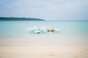 ビーチに到着したおふたり どこまでも広がる青い空と海