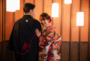綺麗な梅をバックに、色鮮やかな色打掛とモダンな黒紋付き羽織袴がよくはえます
