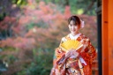 ほんのり橙赤色の木々を背景に、新郎は腕を組んでのシーン。本当に和装がお似合いです。