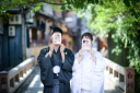 古い街に、傘をさすお二人もまるで絵画のよう。赤と白の和傘は和の雰囲気を一気に盛り上げます!