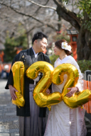 ブーケを手に、満開の桜の下で佇むお二人、 春の京都らしい美しいワンシーン!