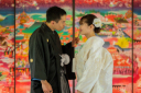 伝統的な和装に身を包んだおふたり。お寺の長廊下での佇まいが、本当に美しかったです。