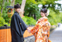 塔の下で、夫婦扇子を手にお互いを見つめ合う幸せいっぱいの一枚。