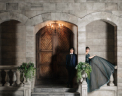 中庭の緑の中、白紋服と色鮮やかな打掛が映えるカットです。
