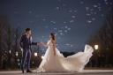 美しくオレンジ色にライトアップされた東京駅前で素敵な笑顔のお二人♡
