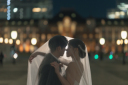 東京駅の美しいライトアップを背景にドレスを靡かせる抱っこショット