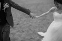 芝生のエリアを手をつないで歩くお二人。ジャケットを脱いだ姿もかっこいいです。