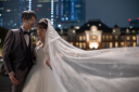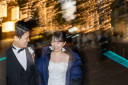 まだ日が暮れ切らないトワイライトタイムに、和田倉門の橋の欄干に腰掛けてバックハグ。お堀の水面には灯り始めた街灯が反射し、お二人の姿をロマンティックに照らします。