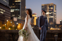 石造りの外壁、アール型の窓、鉄の扉や街灯と、明治生命館のゴージャスな建築意匠が西陽に美しく照らされ、クラシックなタキシードとドレス姿を美しく引き立ててくれます。