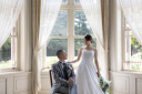 ご新婦がご新郎を後ろから見上げながら腕を回して抱きついた可愛らしいシーン。可憐なポージングがお似合いのご新婦。自然な表情と雰囲気が、お二人らしさを感じさせます。
