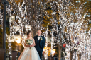 イルミネーションをバックにブーケでおふたりの顔を隠すロマンチックな一枚。顔を隠すショットは王道ですが、イルミネーションの時期ならではの雰囲気になります。