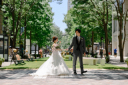 こちらの撮影は夏真っ盛り。街路樹の豊かなグリーンが、ウェディングドレスの純白を引き立てます♪