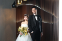 白のキャンバスのような背景の中、リラックスした表情でにこやかにたたずむおふたり。シンプルだからこそ際立つおしゃれな魅力が光る一枚。