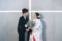 白のキャンバスのような背景の中、リラックスした表情でにこやかにたたずむおふたり。シンプルだからこそ際立つおしゃれな魅力が光る一枚。