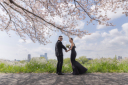 近隣ロケ地の多摩川にやってきました!春になると堤防沿いに桜が咲くので、とっても可愛い写真が撮れちゃいます♪白ドレスと桜と青空がっても綺麗ですね!