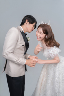 次は白ホリゾンで基本ショット!手をつないだり、腕を組んだり、ふたりらしいポージングも…!他にもいろいろなポージングを白背景では撮影できちゃいます!
