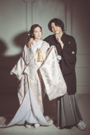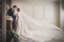 新郎様の膝に新婦様が横になっているところにワンちゃんも近づいてきて、愛が溢れた一枚になっています♪