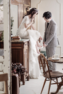 新婦様の元に駆け寄る新郎様。新郎様の笑顔から、新婦様への愛が伝わります♡※こちらはお持ち込みのドレスです。