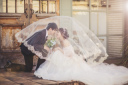 見つめ合っているお二人と大きなベールがとても可愛いです!ベールの種類も沢山あるので素敵なお写真になります♡