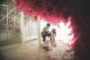 真っ白の階段とピンクのお花がドレスにお似合いですね!シンプルですが可愛い印象になります♫