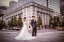 ピンクのウェディングスーツでカジュアル撮影です!お二人の笑顔が本当に素敵ですね♡