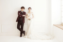 白い背景で下に座ってシンプルに!まるで真っ白の世界にふたりしかいないみたいですね!