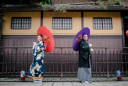 境内の奥には和装での撮影にぴったりな竹林があります!幻想的な竹林の風景と紫と赤の番傘をそれぞれ差しながら歩くお二人の姿をパシャリ!