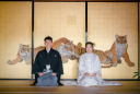 向かい合って手を取り合うお二人の後ろにはシルエットが映し出されています!床の間を照らすライトを活かして、このような新郎新婦様×シルエットのお写真が撮れました!