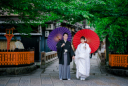 赤と紫の番傘をさして、手を繋いで歩くお二人を撮影!大きな唐門や緑鮮やかな木々を背景に、神社ならではのロケーションで撮影できます!