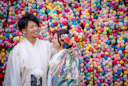 優しい陽の光が差し込む障子をバックに紙風船を投げる楽しそうなお二人♡