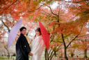 赤く色づいた紅葉をバックに額をコツンとあわせて...