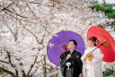 綺麗に咲き誇る桜をバックに結婚しましたガーランドを使ったショットです!