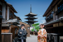 趣のある石の階段や灯篭を背景に背中合わせでカメラ目線。落ち着いた雰囲気が素敵なショットです♪