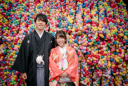 色とりどりのくくり猿がお写真映えばっちり八坂庚申堂でのワンショット。お二人を包みこむような、たくさんのくくり猿が魅力的です♡