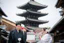 京都らしい建物が並ぶ街並みや五重の塔が入るアングルで、今度は少し下からのアングルで撮影!お二人をいろんな角度から撮影していきます!