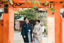 新婦様に日が当たらないように、新郎様が傘をさして。紅葉が色づきはじめた、11月上旬の撮影でした。