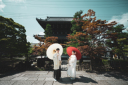 お揃いの和傘を持ちながらゆっくりお庭を散策するおふたり。
