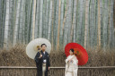 朱色で迫力のある門がお二人を囲ってインパクトありますね。