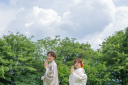 暑い日差しを避けながら、お散歩する懐古園。緑と赤の打掛がすごく引き立て合います