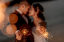 オレンジ色に染まる空の下、手を取り合って踊るおふたり。自然の美しさと愛の調和が感じられる、心温まる写真です。