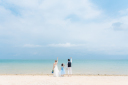 美しい青い海を背景に、おふたりの愛を象徴するショット。海の青さが二人の幸せを引き立て、爽やかな雰囲気が漂います。