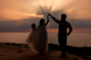 夕日が海に沈む瞬間を背景に、おふたりの姿が映えます。夕陽の光が二人を包み込み、特別な一日を演出します。