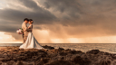 風になびくベールが、新婦の美しさを際立たせる一枚。自然の力が愛と幸せを感じさせる特別な瞬間です。
