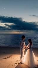 夕陽が沈む海辺での一枚。美しいサンセットが背景となり、おふたりの愛と幸せが輝く瞬間を捉えました。