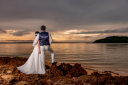 夕焼けの光に包まれたロマンチックな一瞬。黄昏時の風景が二人を彩り、特別なひとときを演出します。