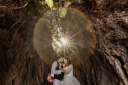 木漏れ日の中で、二人のシルエットが柔らかく浮かび上がるショット。自然の光と影が織りなす、美しく幻想的な一枚です。